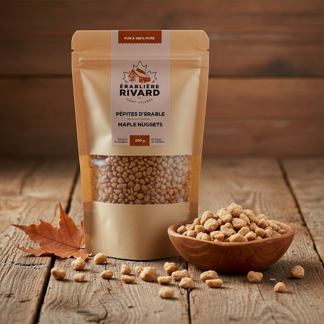 Un sucre d’érable pur, fabriqué directement à notre érablière familiale de St-Sylvère. À l’Érablière Rivard, on transforme la sève d’érable avec le même savoir-faire depuis des générations. Résultat : des pépites naturellement sucrées, parfumées et polyvalentes, obtenues à partir de sirop d’érable 100 % pur… rien d’autre.