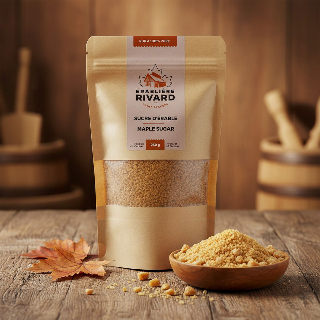 Un sucre d’érable pur, fabriqué directement à notre érablière familiale de St-Sylvère. À l’Érablière Rivard, on transforme la sève d’érable avec le même savoir-faire depuis des générations. Résultat : un sucre naturellement sucré, parfumé et polyvalent, obtenu à partir de sirop d’érable 100 % pur… rien d’autre.